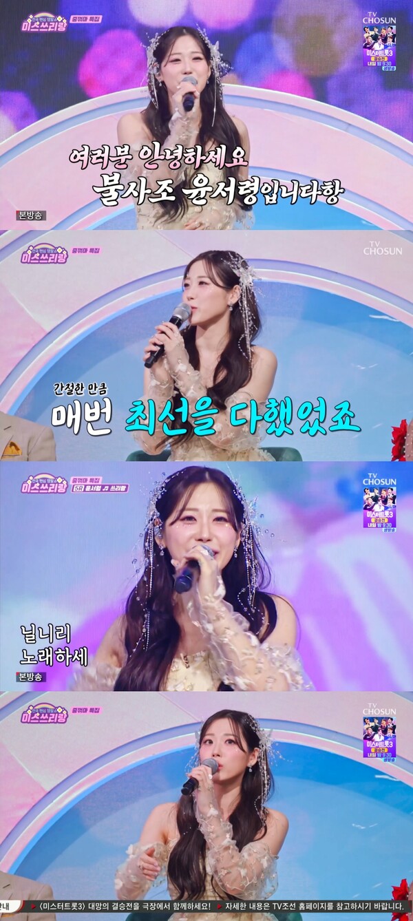 윤서령의 매력은 여기서 끝이 아니에요. 지난 3월 12일 TV CHOSUN ‘미스쓰리랑–중.꺾.마’ 특집에서도 그녀는 ‘트롯 불사조’의 밝은 에너지를 선보였습니다. 이날 방송에서 임채무, 이봉주 등과 함께 ‘불사조팀’으로 출연한 윤서령은 ‘미스트롯3’ TOP7 출신 정슬과 대결을 펼쳤죠. 두 사람은 ‘미스트롯3’ 대학부 팀원 출신이자 패자부활전을 거친 공통점을 갖고 있어, 무대 전 유쾌한 신경전으로 객석을 웃음바다로 만들었습니다.
